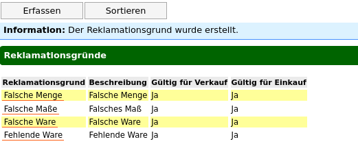 Unter dem Menu "System->Reklamationsgründe" muss mindestens ein Reklamationsgrund erfasst werden.